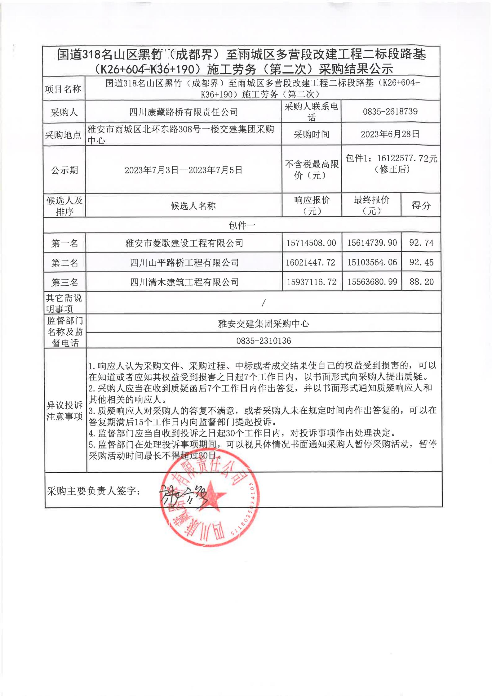 四川康藏路橋有限責任公司國道318名山區(qū)黑竹(成都界)至雨城區(qū)多營段改建工程二標段路基(K26+604-K36+190)施工勞務(第二次)采購結(jié)果公示