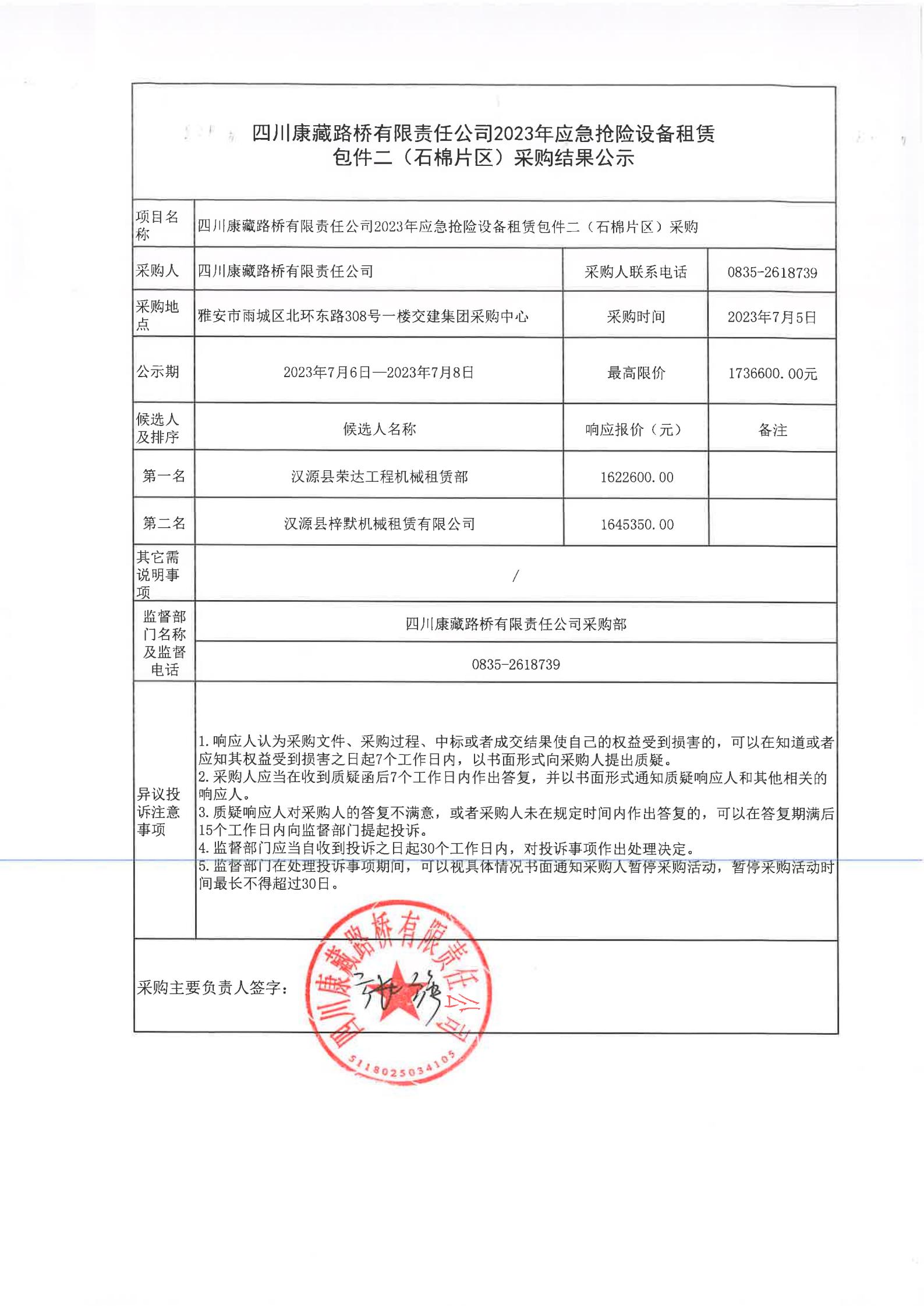 四川康藏路橋有限責(zé)任公司2023年應(yīng)急搶險(xiǎn)設(shè)備租賃包件二(石棉片區(qū))采購結(jié)果公示