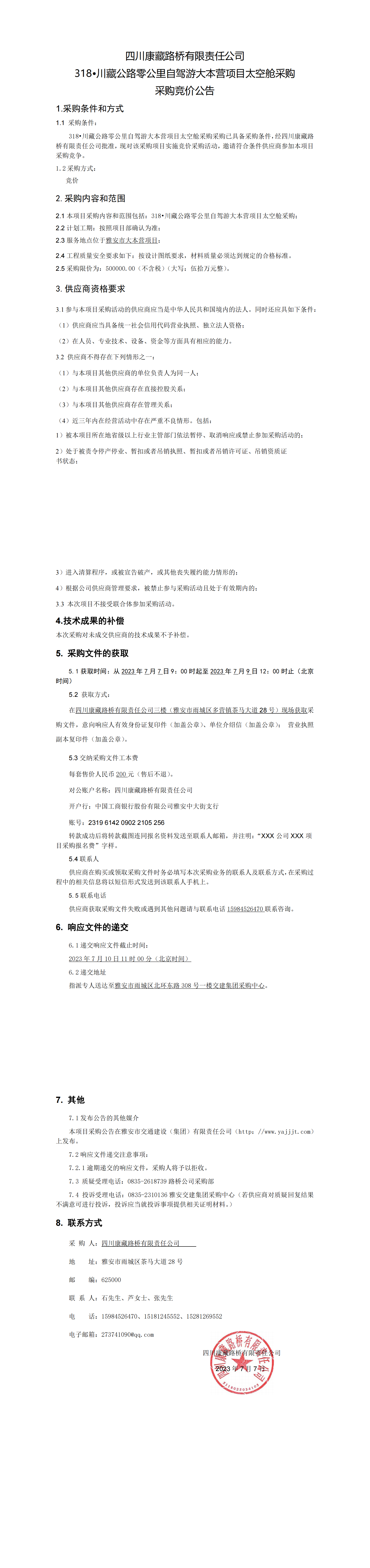 四川康藏路橋有限責任公司318·川藏公路零公里自駕游大本營項目太空艙采購競價公告