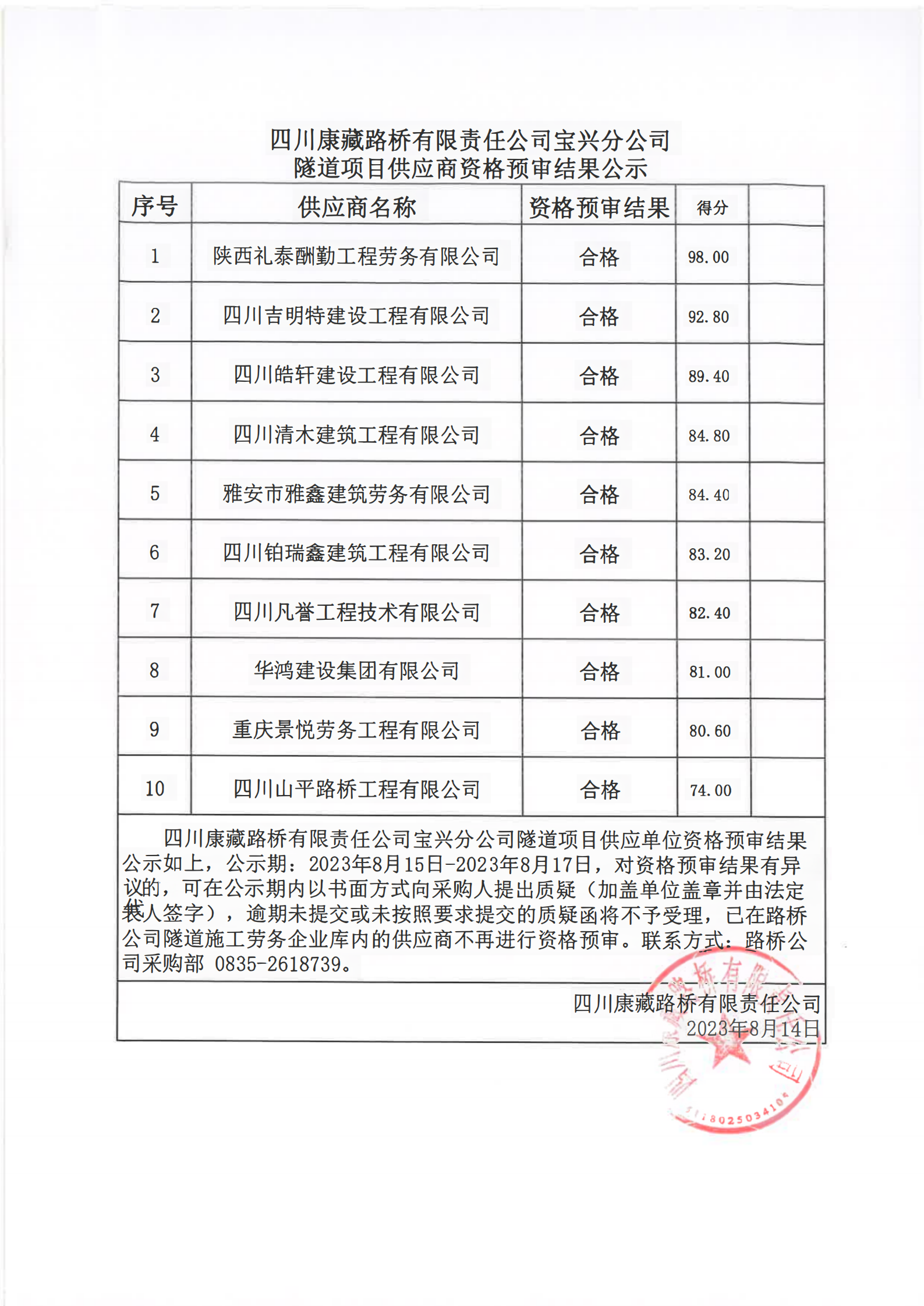 四川康藏路橋有限責(zé)任公司寶興分公司隧道項目供應(yīng)商資格預(yù)審結(jié)果公示