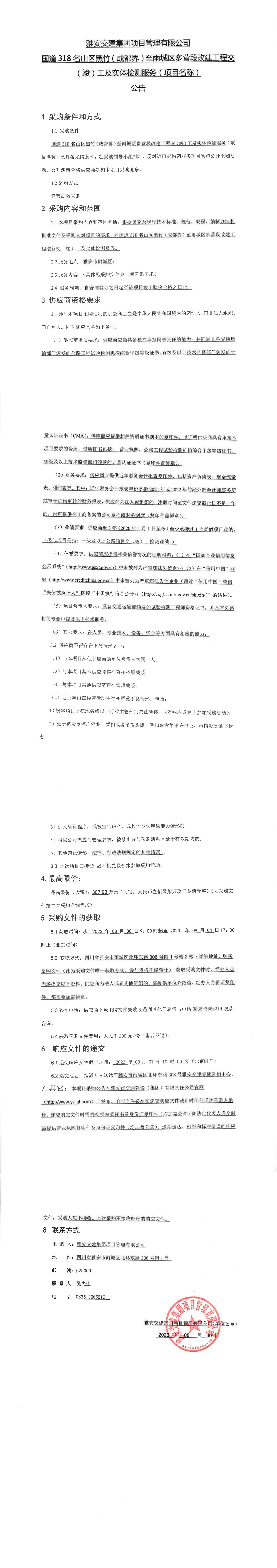 雅安交建集團項目管理有限公司國道318名山區(qū)黑竹(成都界)至雨城區(qū)多營段改建工程交(竣)工及實體檢測服務(wù)(項目名稱)采購公告