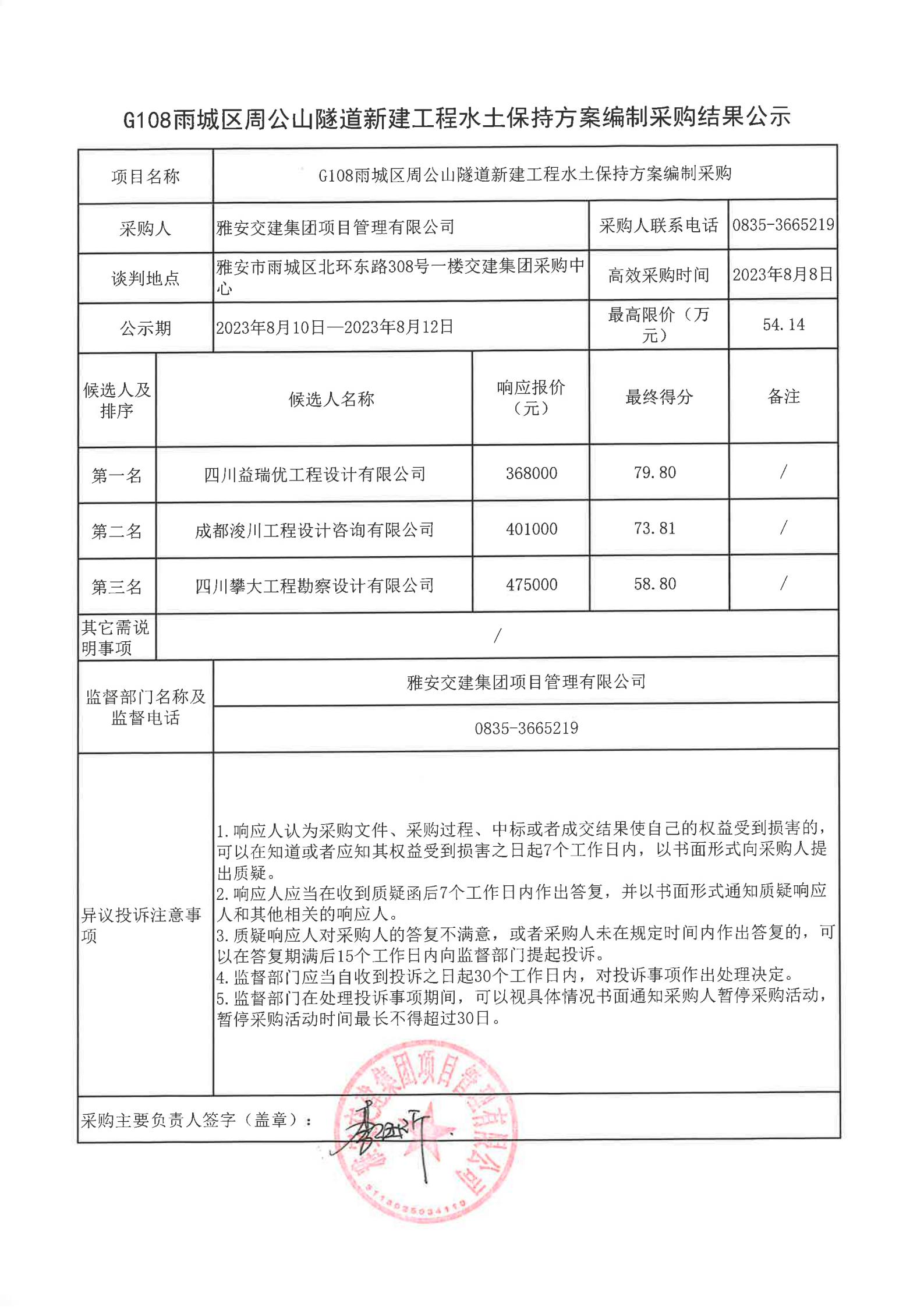 雅安交建集團(tuán)項(xiàng)目管理有限公司G108雨城區(qū)周公山隧道新建工程水土保持方案編制采購(gòu)結(jié)果公示