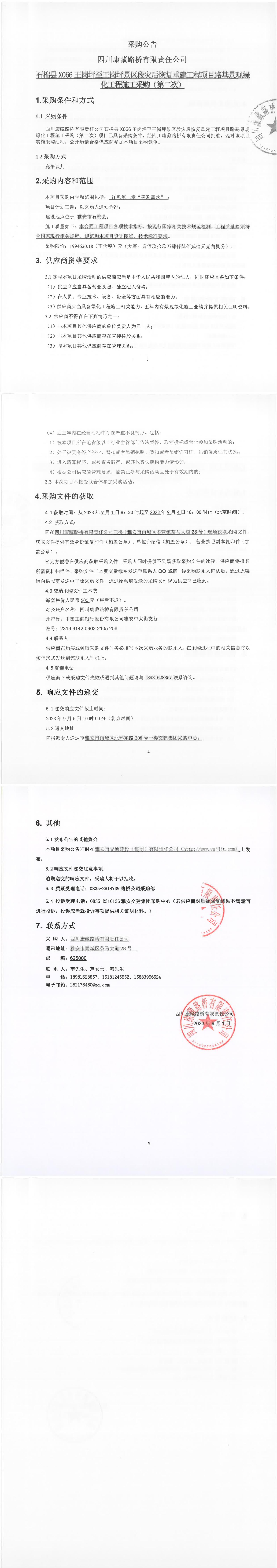 四川康藏路橋有限責(zé)任公司石棉縣X066王崗坪至王崗坪景區(qū)段災(zāi)后恢復(fù)重建工程項(xiàng)目路基景觀綠化工程施工采購(gòu)(第二次)