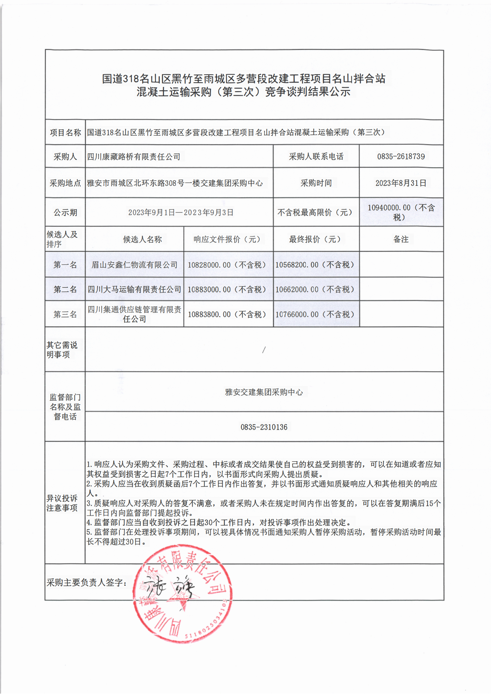 四川康藏路橋有限責任公司國道318名山區(qū)黑竹至至雨城區(qū)多營段改建工程項目名山拌合站混凝土運輸采購(第三次)競爭談判結果公示