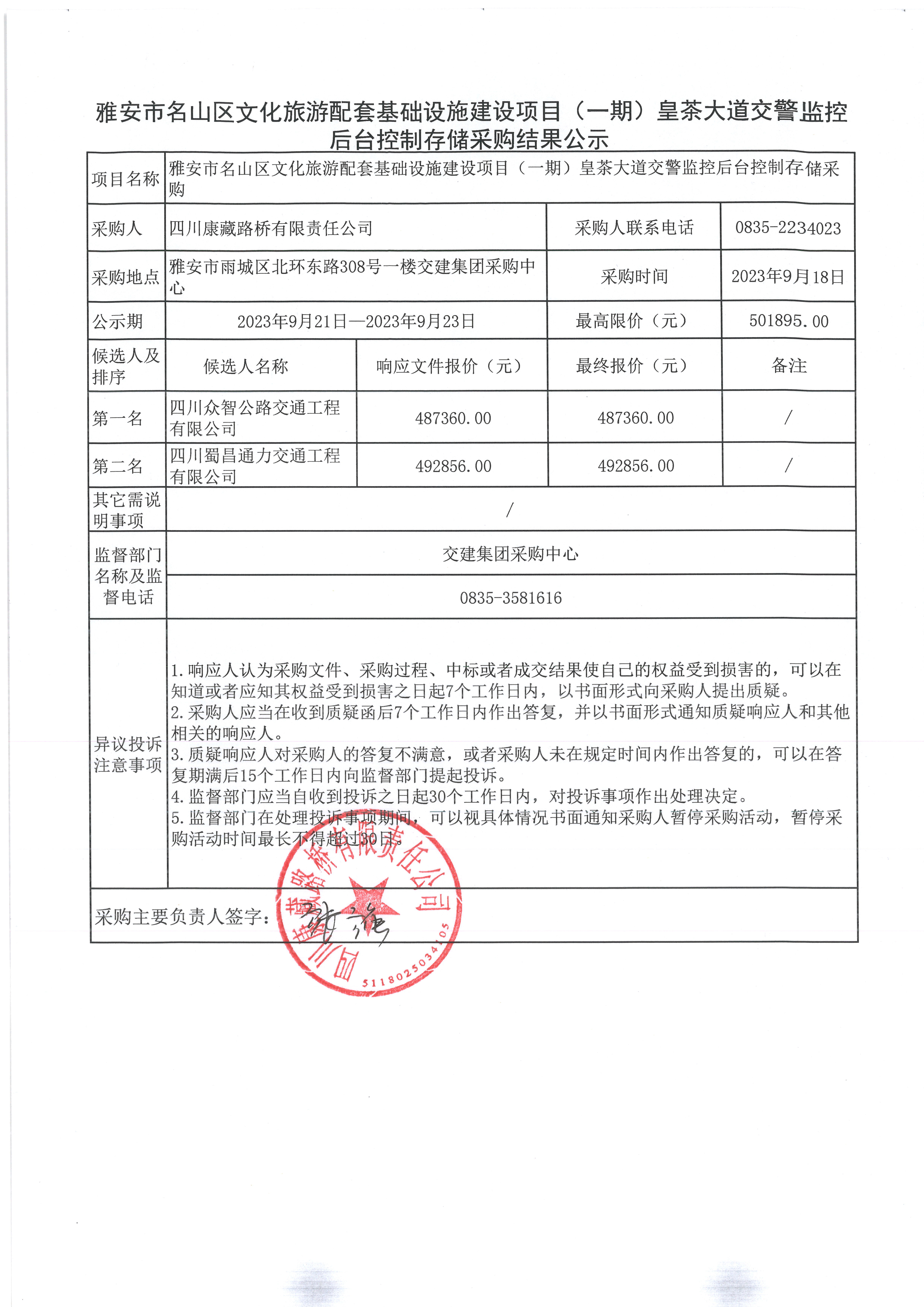四川康藏路橋有限責任公司雅安市名山區(qū)文化旅游配套基礎設施建設項目(一期)皇茶大道交警監(jiān)控后臺控制存儲采購結果公示