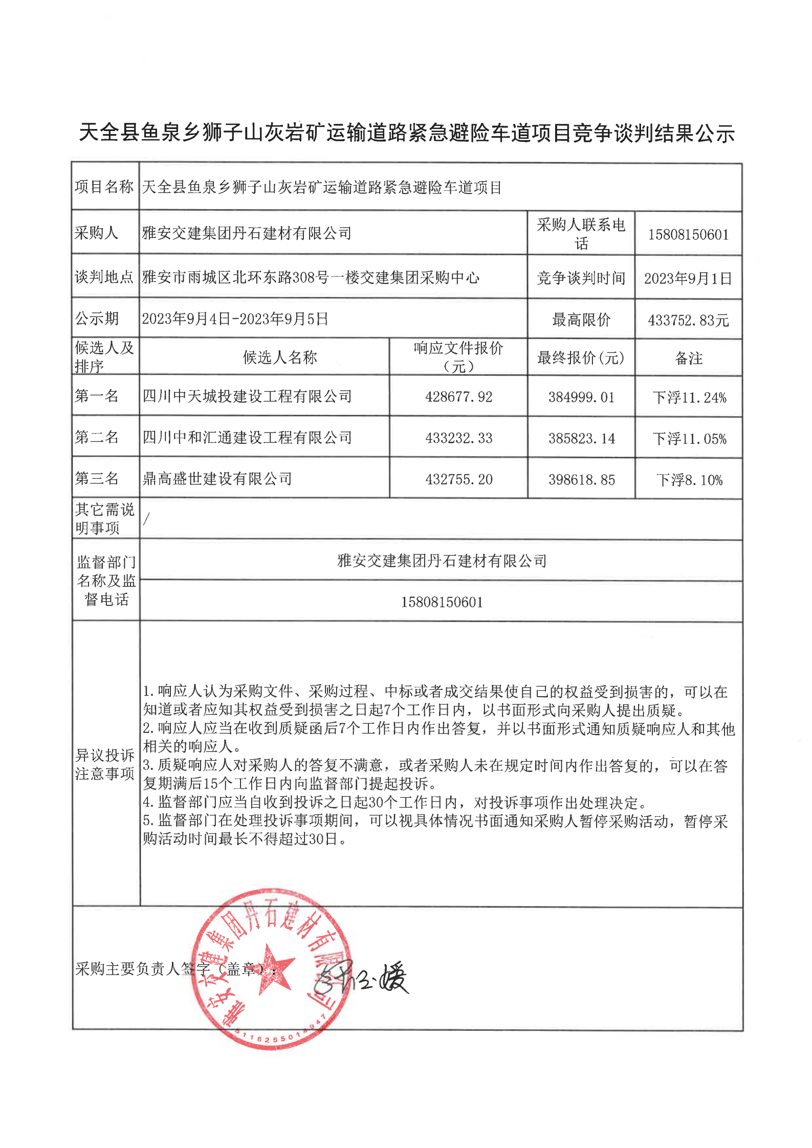雅安交建集團丹石建材有限公司天全縣魚泉鄉(xiāng)獅子山灰?guī)r礦運輸道路緊急避險車道項目競爭談判結果公示