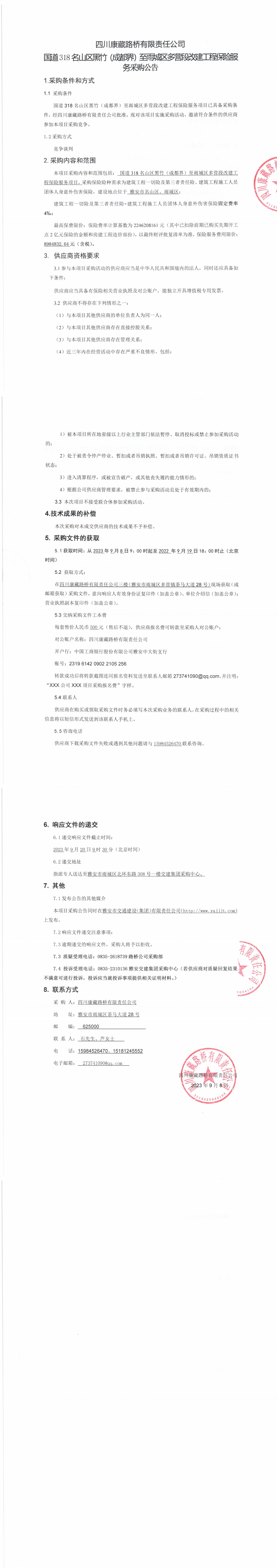 四川康藏路橋有限責(zé)任公司國(guó)道318名山區(qū)黑竹(成都界)至雨城區(qū)多營(yíng)段改建工程保險(xiǎn)服務(wù)采購(gòu)公告