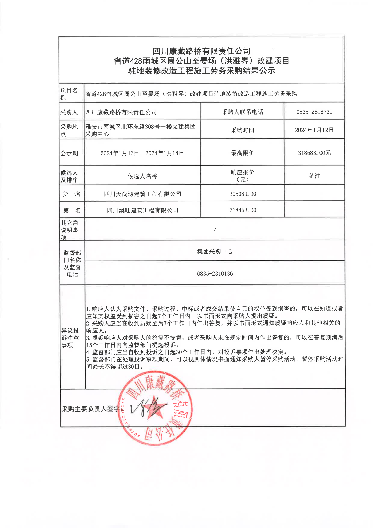 四川康藏路橋有限責任公司省道428雨城區(qū)周公山至晏場(洪雅界)改建項目駐地裝修改造工程施工勞務采購結果公示