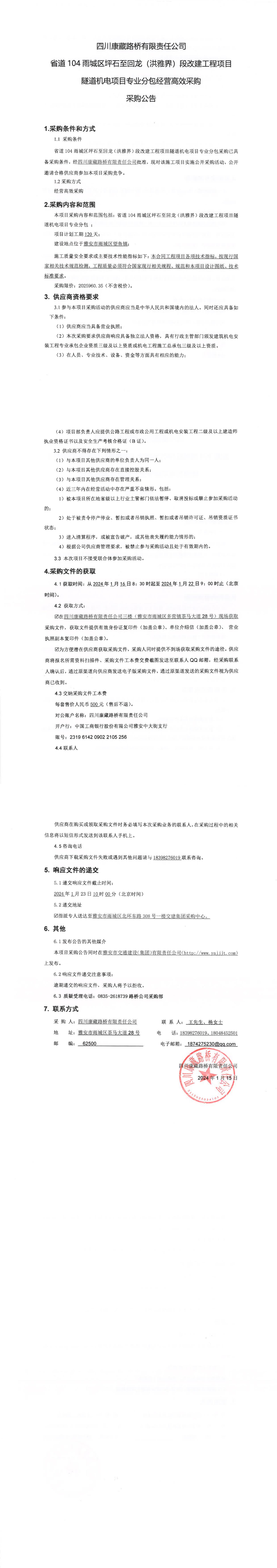 四川康藏路橋有限責(zé)任公司省道104雨城區(qū)坪石至回龍(洪雅界)段改建工程項(xiàng)目隧道機(jī)電項(xiàng)目專業(yè)分包經(jīng)營高效采購公告