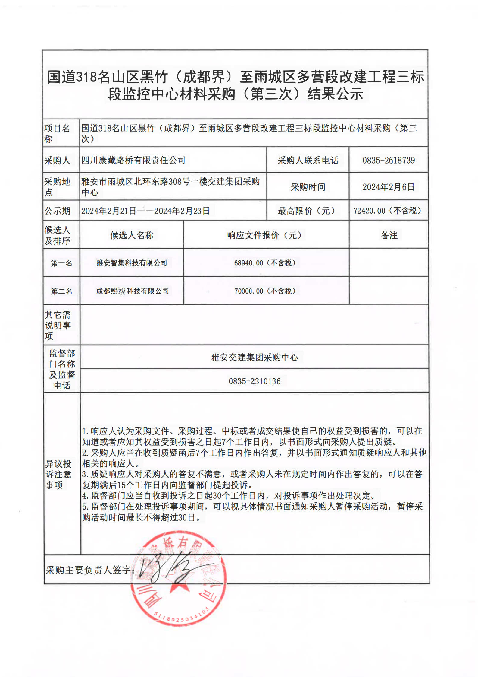 四川康藏路橋有限責任公司國道318名山區(qū)黑竹(成都界)至雨城區(qū)多營段改建工程三標段監(jiān)控中心材料采購(第三次)結(jié)果公示
