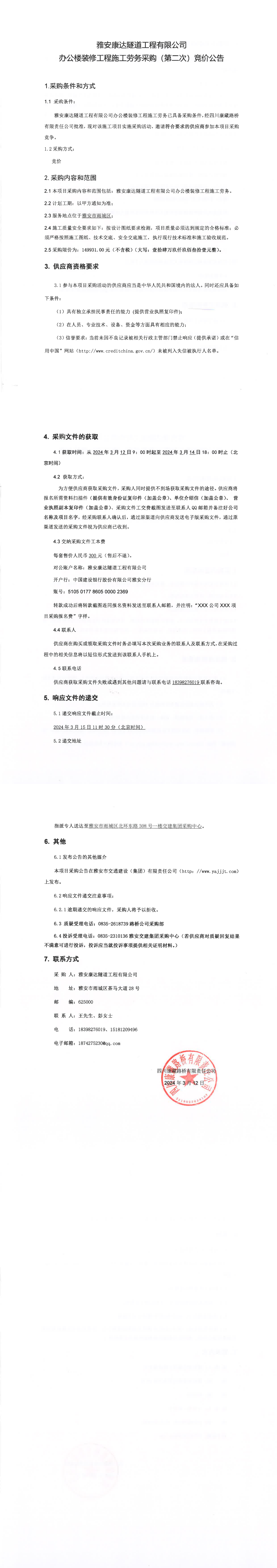 雅安康達(dá)隧道工程有限公司辦公樓裝修工程施工勞務(wù)競(jìng)價(jià)采購(gòu)(第二次)公告