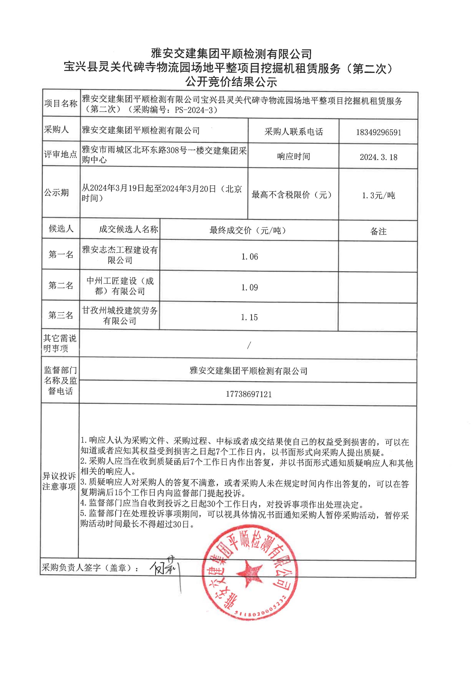 雅安交建集團平順檢測有限公司寶興縣靈關代碑寺物流園場地平整項目挖掘機租賃服務(第二次)競價結(jié)果公示