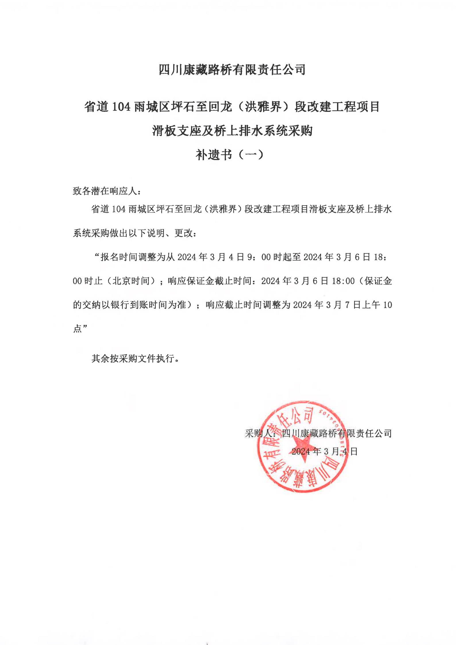 四川康藏路橋有限責(zé)任公司省道104雨城區(qū)坪石至回龍(洪雅界)段改建工程項目滑板支座及橋上排水系統(tǒng)采購補遺書(一)