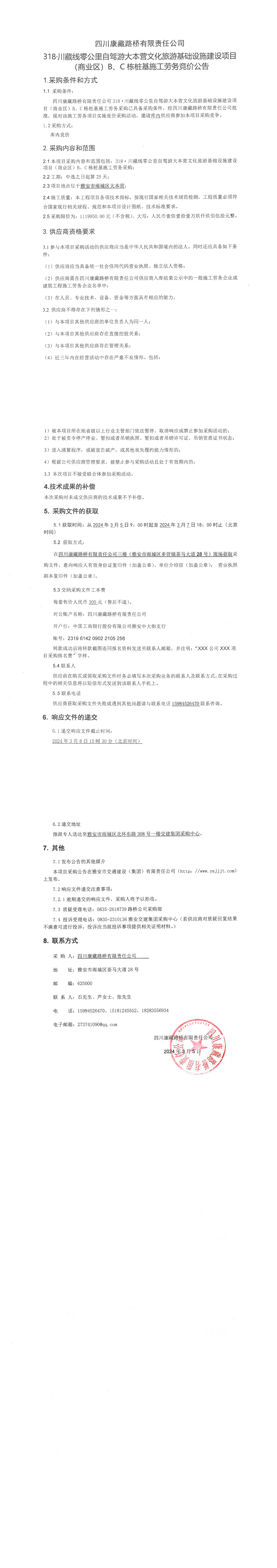 四川康藏路橋有限責任公司318·川藏公路零公里自駕游大本營文化旅游基礎設施建設項目(商業(yè)區(qū))B\C棟樁基施工勞務競價公告