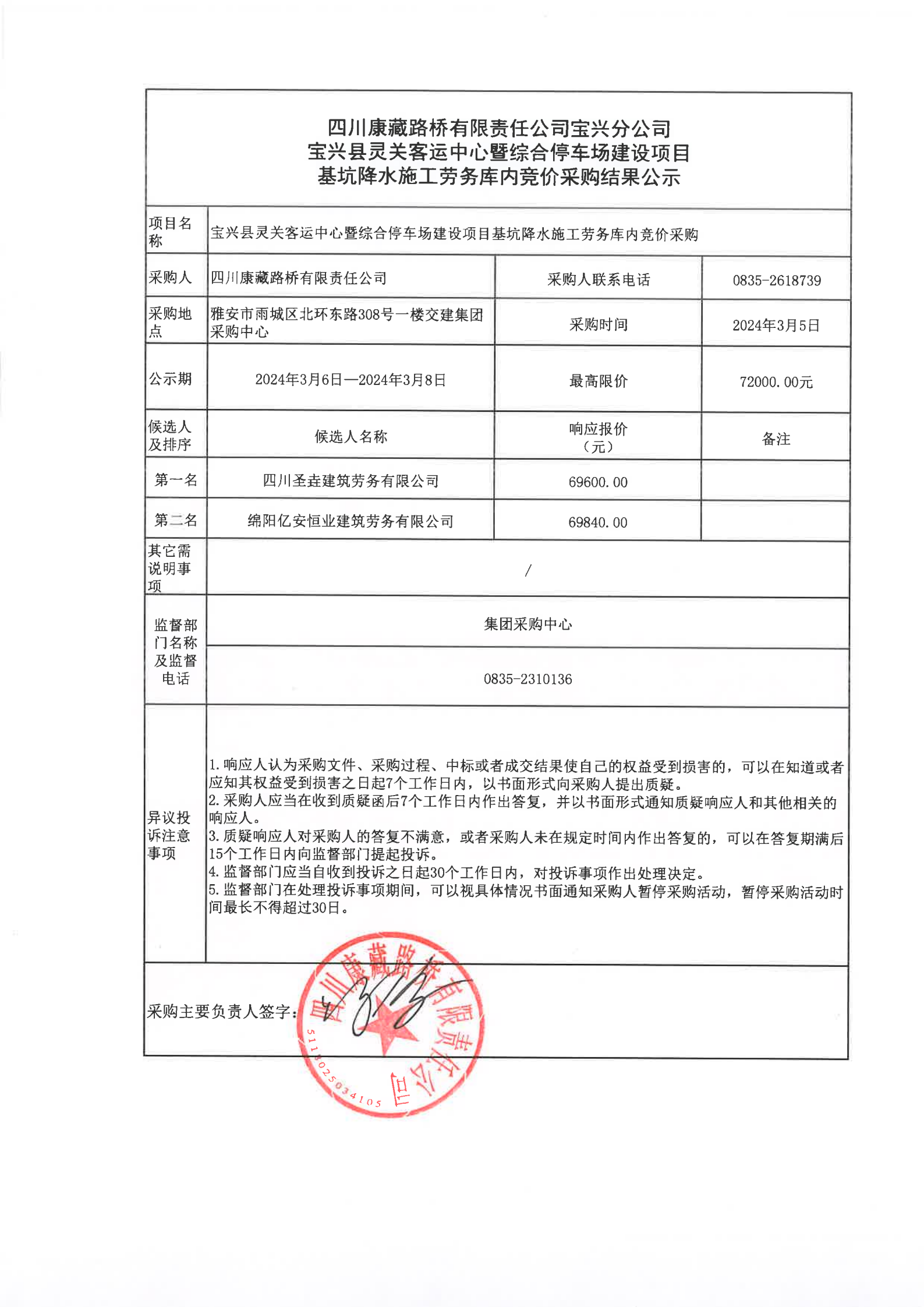四川康藏路橋有限責任公司寶興分公司寶興縣靈關客運站中心暨綜合停車場建設項目基坑降水施工勞務庫內(nèi)競價采購結果公示
