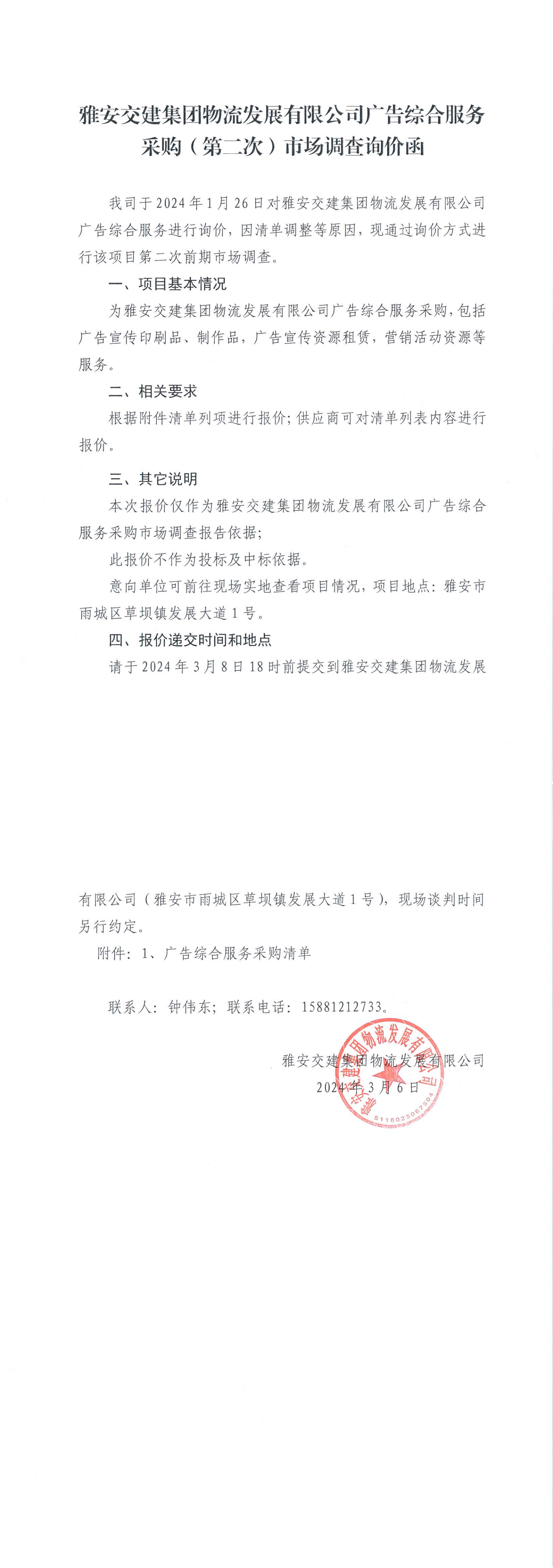 雅安交建集團(tuán)物流發(fā)展有限公司廣告綜合服務(wù)采購(gòu)(第二次)市場(chǎng)調(diào)查詢價(jià)函