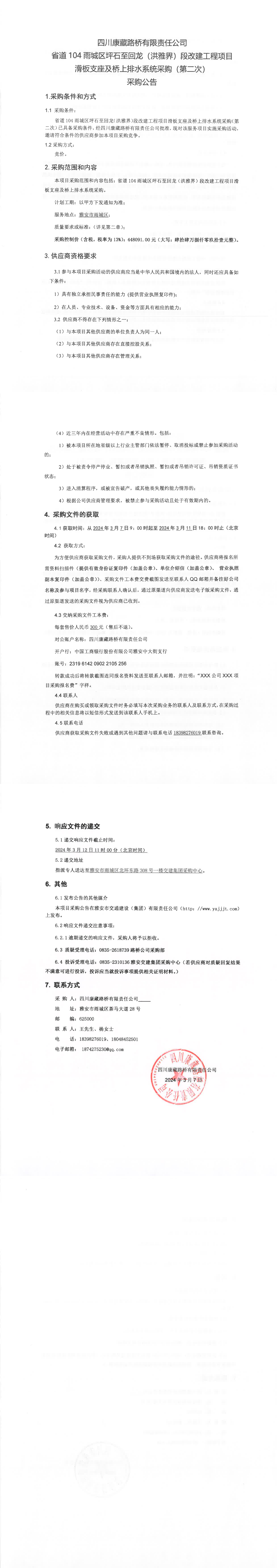 四川康藏路橋有限責(zé)任公司省道104雨城區(qū)坪石至回龍(洪雅界)段改建工程項目滑板支座及橋上排水系統(tǒng)采購(第二次)采購公告