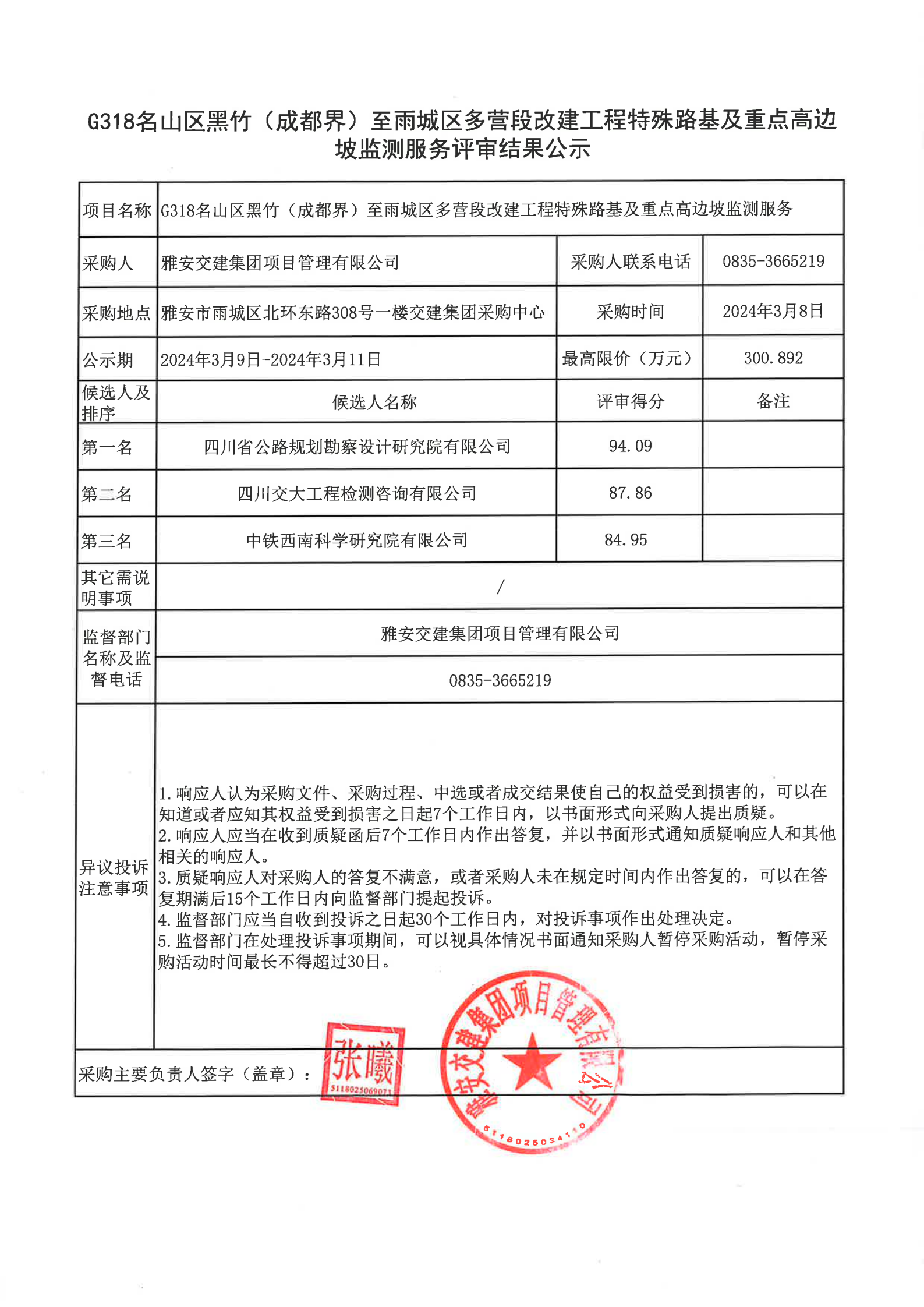 雅安交建集團項目管理有限公司G318名山區(qū)黑竹(成度界)至雨城區(qū)多營段改建工程特殊路基及重點高邊坡監(jiān)測服務評審結果公示