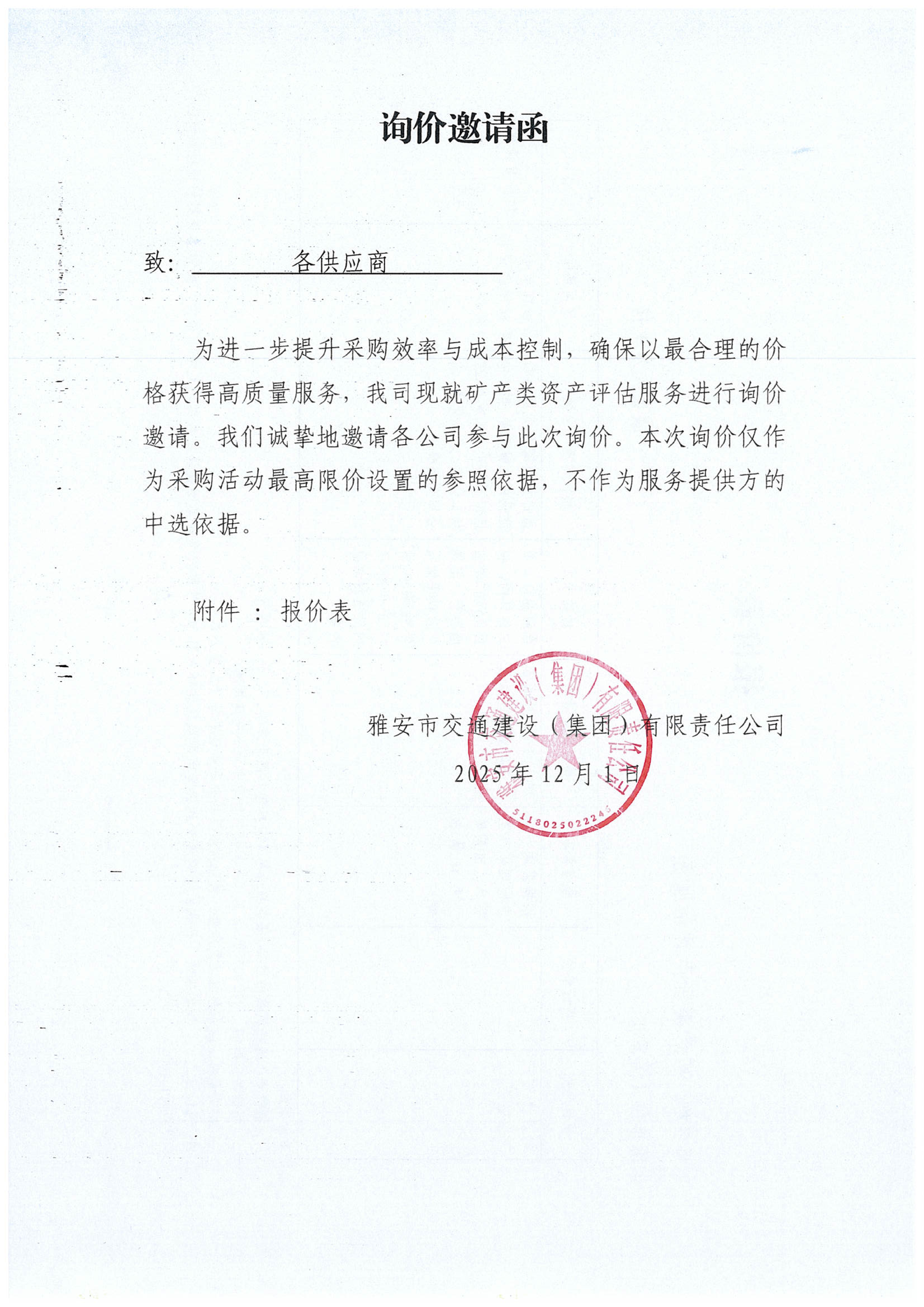關于雅安市交通建設(集團)有限責任公司礦產(chǎn)類資產(chǎn)評估服務采購限價的詢價函