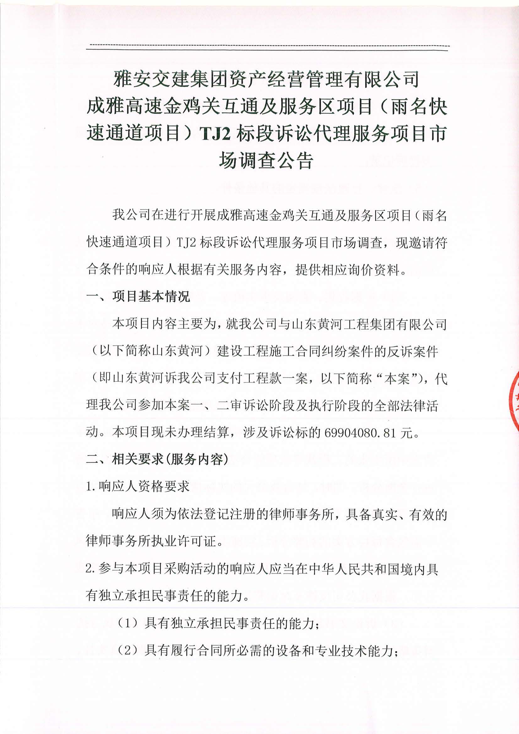 雅安交建集團(tuán)資產(chǎn)經(jīng)營管理有限公司成雅高速金雞關(guān)互通及服務(wù)區(qū)項(xiàng)目(雨名快速通道項(xiàng)目)TJ2標(biāo)段訴訟代理服務(wù)項(xiàng)目市場(chǎng)調(diào)查公告