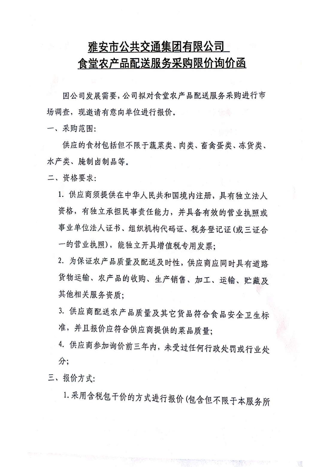關(guān)于雅安市公共交通集團(tuán)有限公司食堂農(nóng)產(chǎn)品配送服務(wù)采購限價(jià)的詢價(jià)函