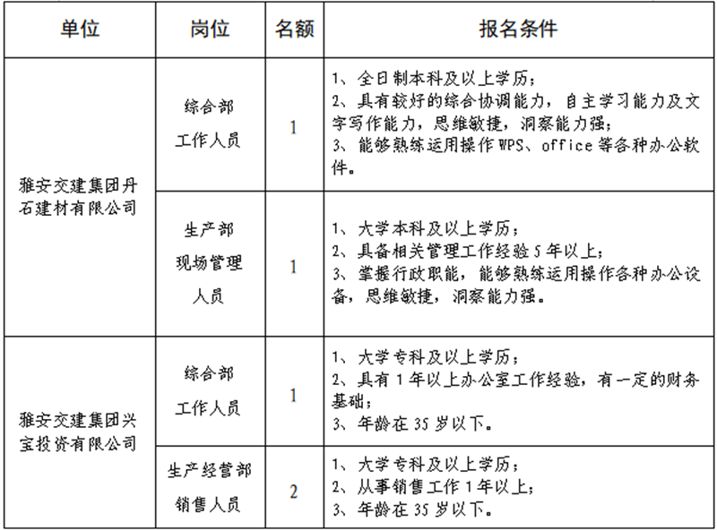雅安交建集團(tuán)關(guān)于公開(kāi)招聘所屬子公司砂石建材公司工作人員的公告