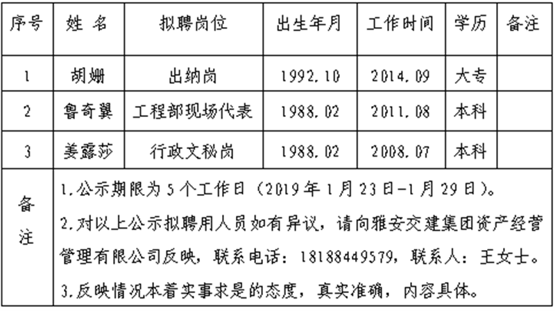 通過公開報(bào)名、資格審查、筆試、面試等程序,經(jīng)雅安交建集團(tuán)資產(chǎn)經(jīng)營管理有限公司研究,對以下