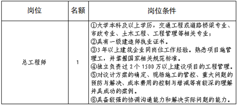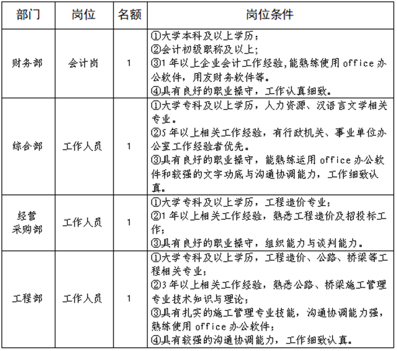 雅安交建集團路橋有限責任公司是雅安市交通建設(集團)有限責任公司下屬子公司,主要從事道路、橋梁修建。現(xiàn)根據(jù)公司業(yè)務發(fā)展需要,擬向社會公開招聘總工程師1名,工作人員4名,現(xiàn)將有關事項公告如下: