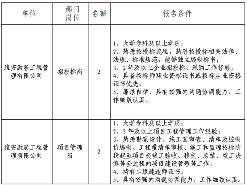 雅安交建集團關于公開招聘所屬子公司工作人員的公告(康居公司)