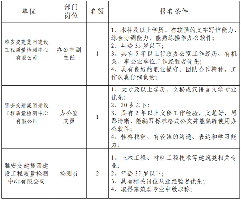 雅安交建集團(tuán)關(guān)于公開招聘所屬子公司工作人員的公告(建設(shè)工程質(zhì)量檢測中心)