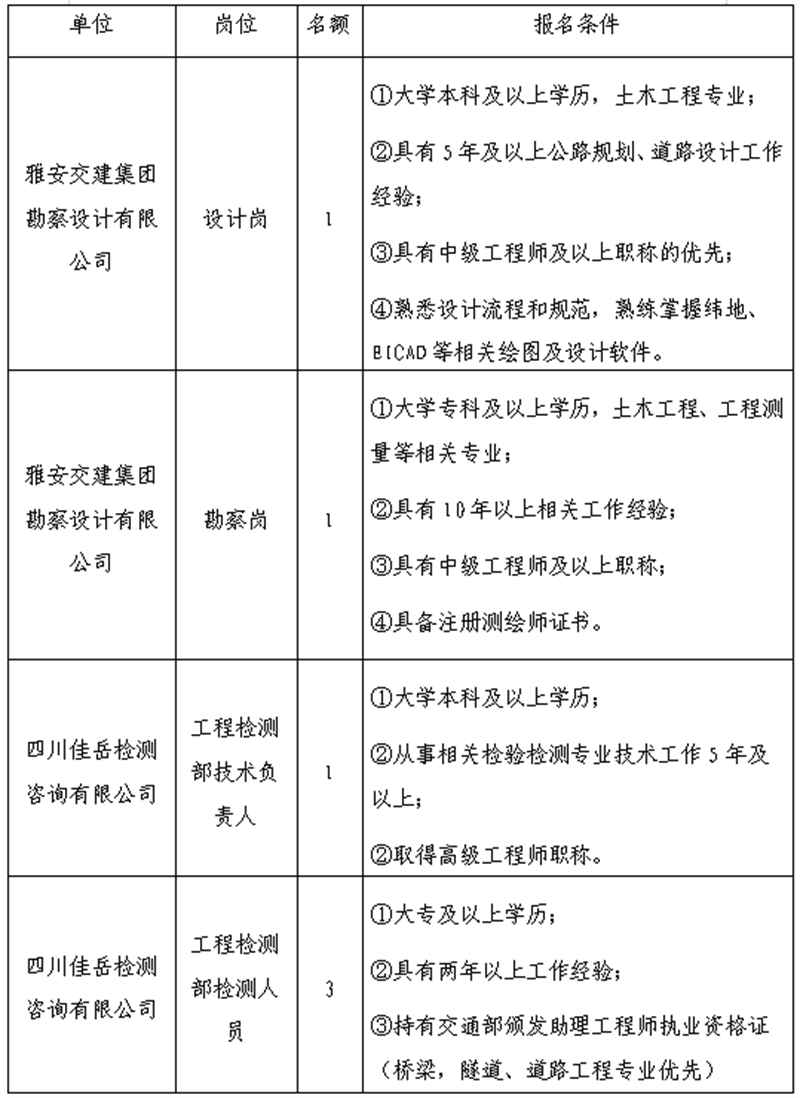 雅安交建集團關于公開招聘所屬子公司工作人員的公告(勘察設計公司、佳岳公司)