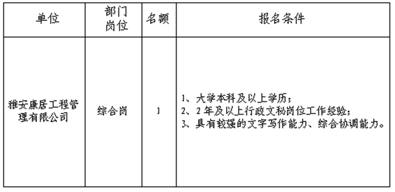 根據(jù)發(fā)展需要,決定面向社會公開招聘雅安市交通建設(集團)有限責任公司(以下簡稱雅安交建集團)所屬子公司工作人員1名,現(xiàn)將有關事項公告如下: