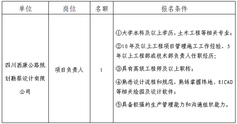 根據(jù)發(fā)展需要,決定面向社會(huì)公開招聘雅安市交通建設(shè)(集團(tuán))有限責(zé)任公司(以下簡(jiǎn)稱“雅安交建集團(tuán)”)所屬子公司項(xiàng)目負(fù)責(zé)人1名,現(xiàn)將有關(guān)事項(xiàng)公告如下: