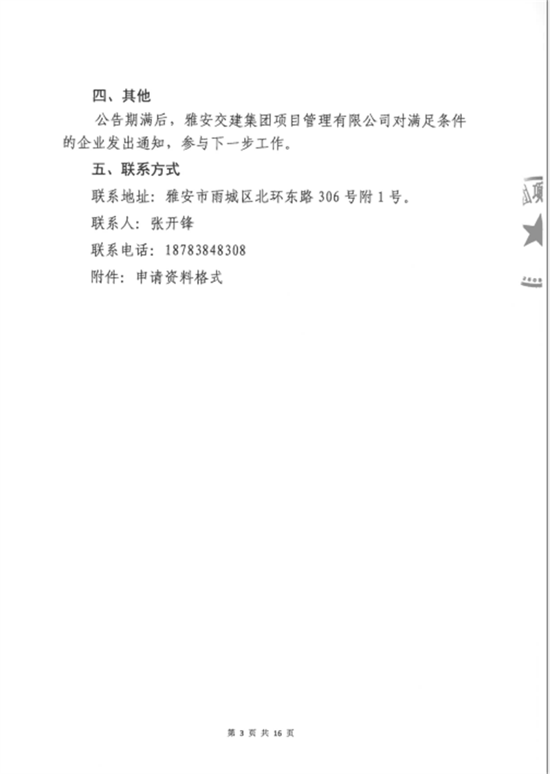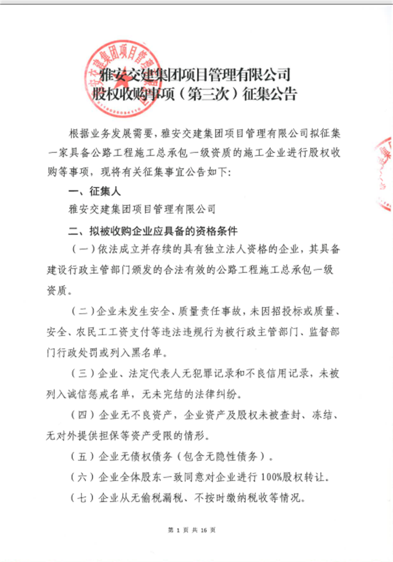 雅安交建集團(tuán)項(xiàng)目管理有限公司股權(quán)收購事項(xiàng)(第三次)征集公告