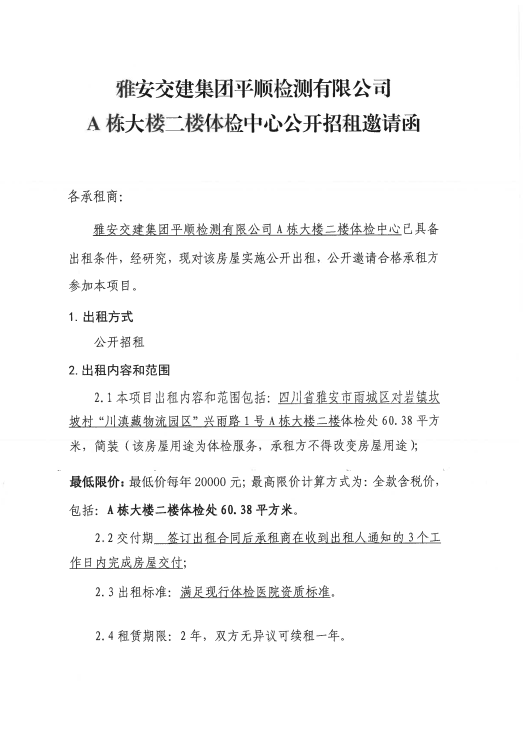 平順公司A棟大樓二樓體檢中心公開(kāi)招租邀請(qǐng)函