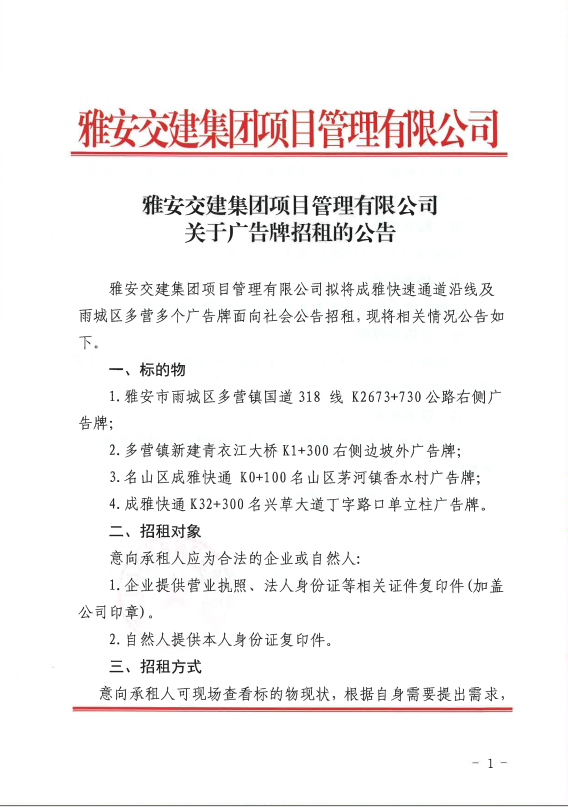 雅安交建集團項目管理有限公司關(guān)于廣告牌招租的公告