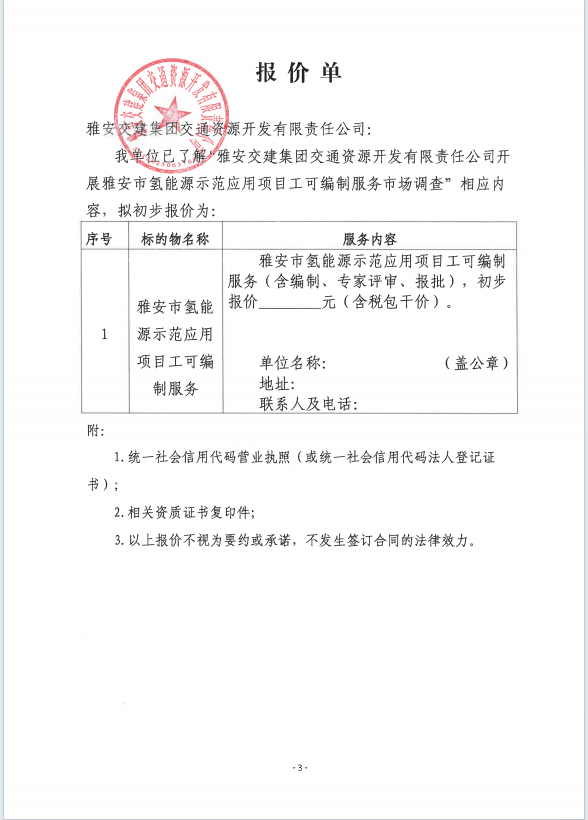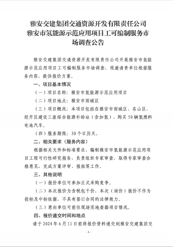 雅安交建集團(tuán)交通資源開發(fā)有限責(zé)任公司雅安市氫能源示范應(yīng)用項(xiàng)目工可編制服務(wù)市場調(diào)查公告