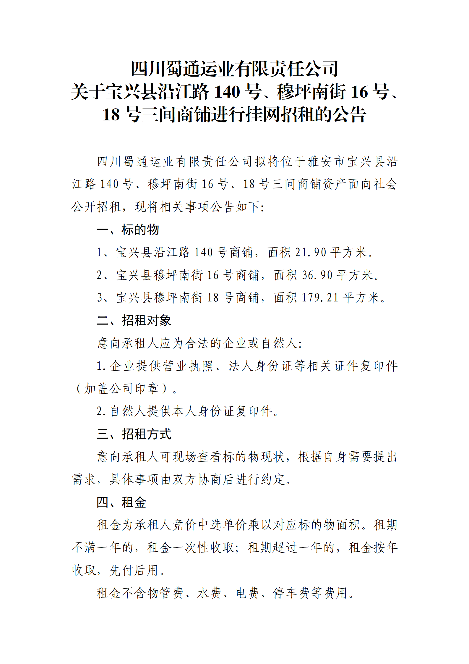 四川蜀通運業(yè)有限責任公司 關于寶興縣沿江路140號、穆坪南街16號、18號三間商鋪進行掛網招租的公告