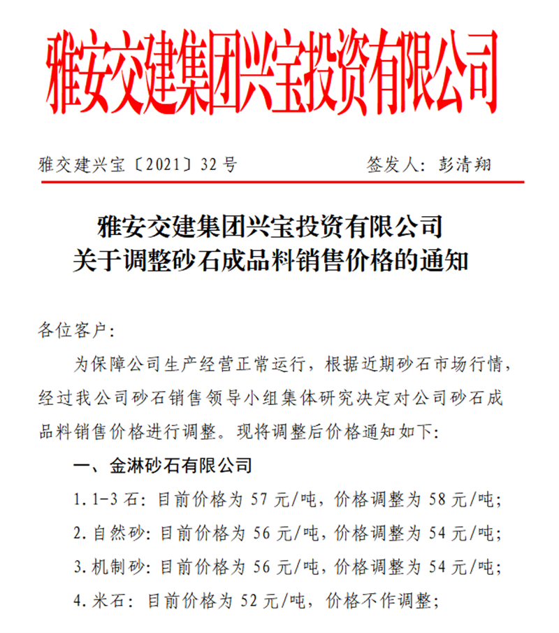 雅安交建集團(tuán)興寶公司砂石骨料銷售價格情況表(2021.5.22)