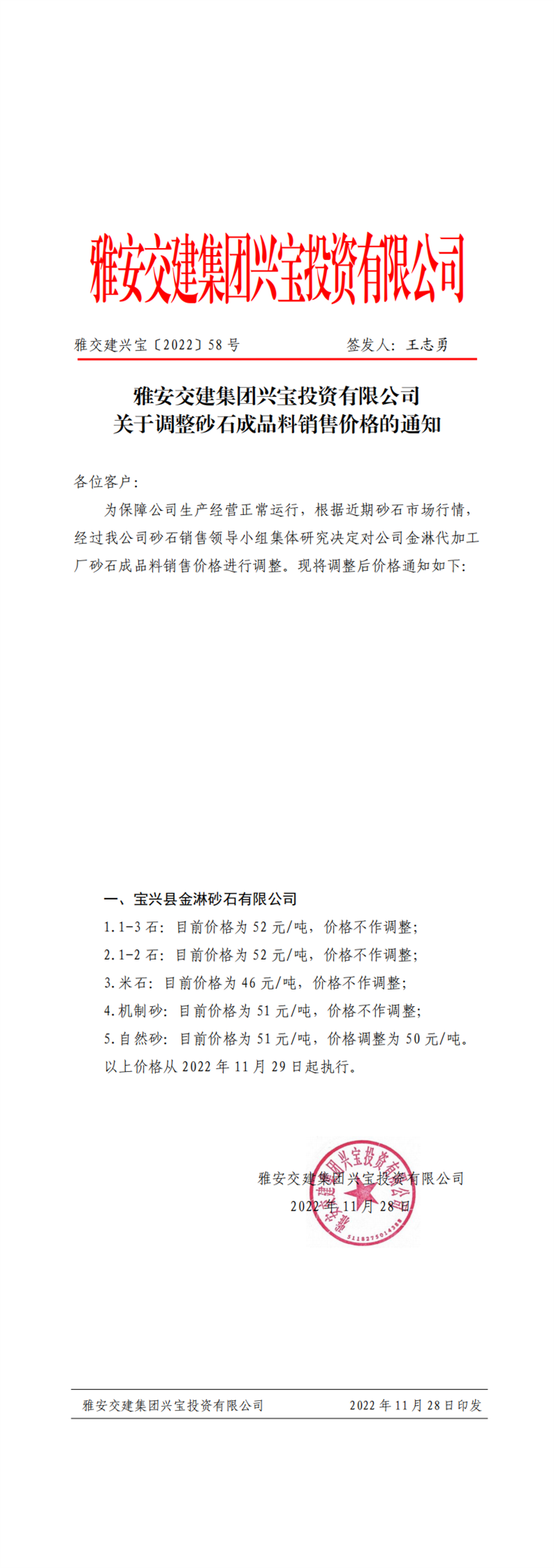 雅交建興寶〔2022〕58號 關(guān)于調(diào)整砂石成品料銷售價格的通知