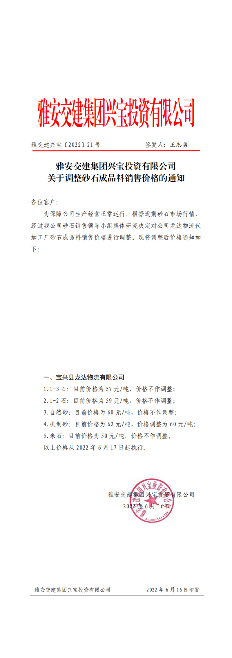 ÑŰ²½»½¨¼¯ˆF(tu¨¢n)ÅdŒšÍ¶ÙYÓÐÏÞ¹«Ë¾ êP(gu¨¡n)ÓÚÕ{(di¨¤o)Õûɰʯ³ÉÆ·ÁÏäN(xi¨¡o)ÊÛƒr(ji¨¤)¸ñµÄ֪ͨ£¨2022.6.16£©