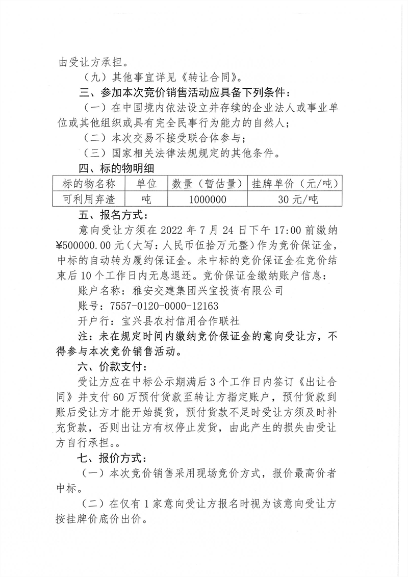 興寶公司寶興縣靈關(guān)鎮(zhèn)代碑寺土地整理項(xiàng)目10萬(wàn)噸可利用棄渣競(jìng)價(jià)銷(xiāo)售掛網(wǎng)公告掛網(wǎng)公告7.22(5萬(wàn)噸)