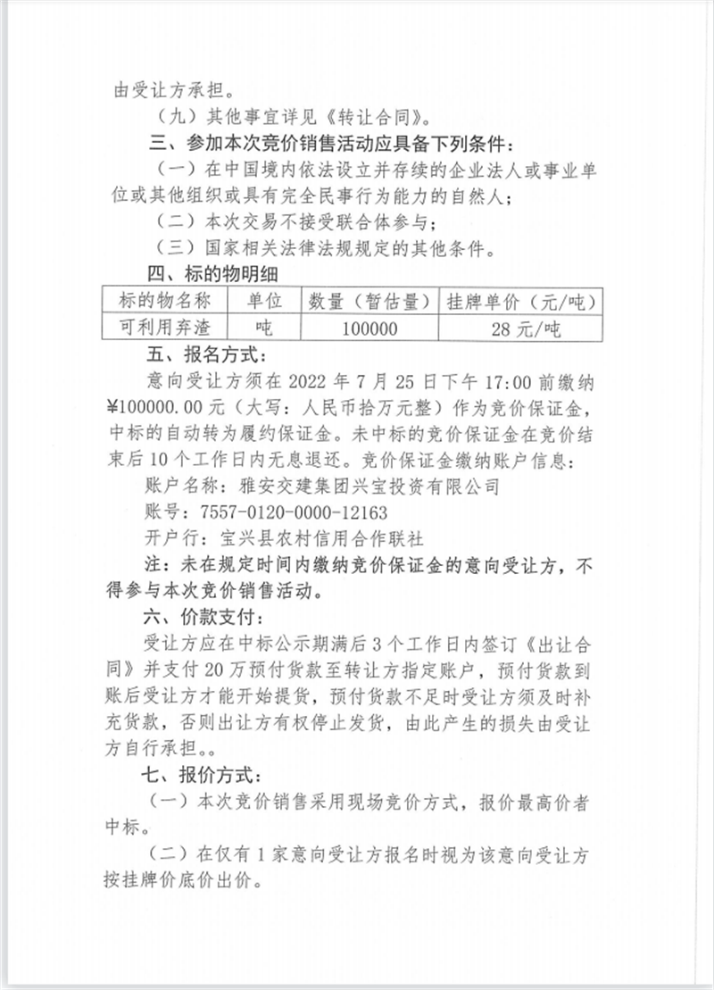 興寶公司寶興縣靈關鎮(zhèn)代碑寺土地整理項目10萬噸可利用棄渣競價銷售掛網(wǎng)公告掛網(wǎng)公告7.22(5萬噸)