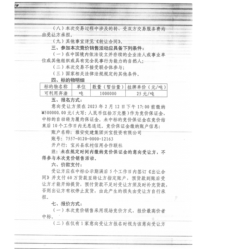 雅安交建集團(tuán)興寶投資有限公司100萬噸可利用棄渣競價(jià)銷售流標(biāo)公告(2023.2.13)