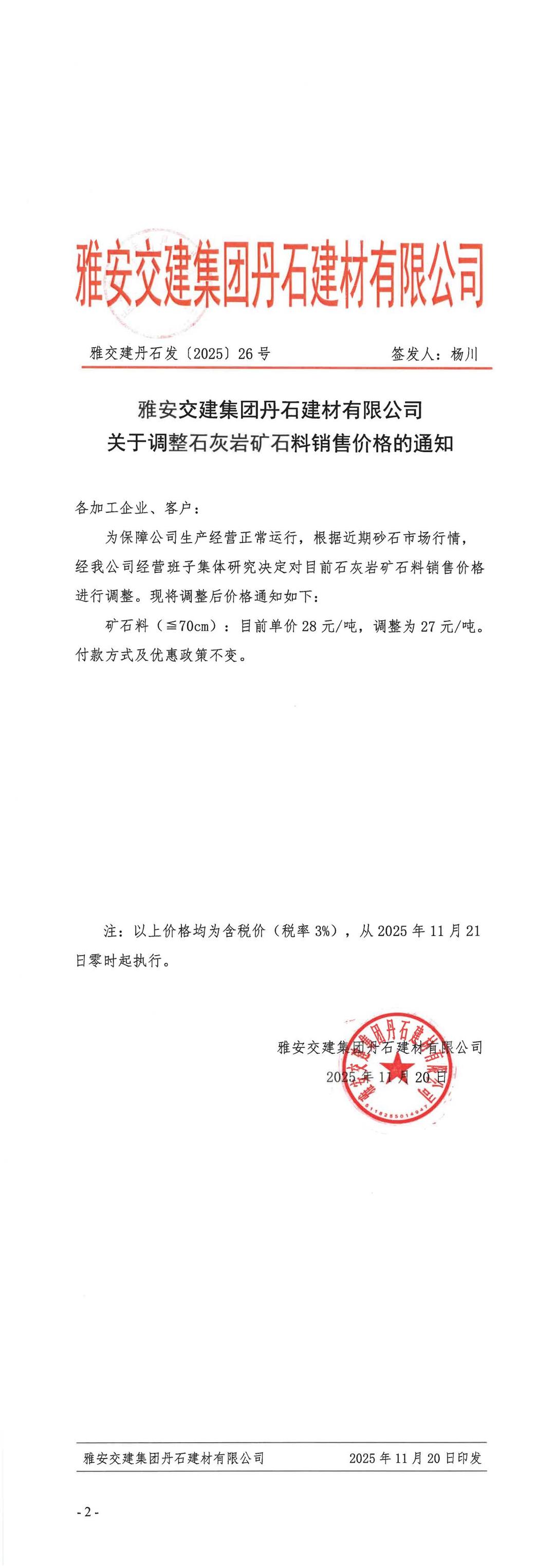 雅安交建集團云石建材有限公司關于調(diào)整石灰?guī)r礦石料銷售價格的通知(2025.11.20)